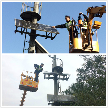 12月12日,集團工程養護部機電設備維養中心主任助理葉俊及中心幾名隊員,站在凳高車上,頂著寒風,利用事先準備的手動洗車水槍、拖布等清潔工具對公司路面攝像頭太陽能板進行一一清洗,使原先布滿污垢的面板立刻變得光亮如新。 集團沿線共有40多塊太陽能板。近日,維養中心在設備巡檢中發現路面攝像頭太陽能板普遍存在充電電流不足的現象,致使電瓶無法完全充電,一到陰雨天氣或晚上就不能保障攝像頭正常運轉。這些太陽能板由于使用年限久(基本都在10年以上),部分面板晶片已出現老化破損,加上冬季日照時間短、強度低等自然因素影響,導致設備無法有效運轉,但如果全部更換不僅成本高,而且費時又費力。
