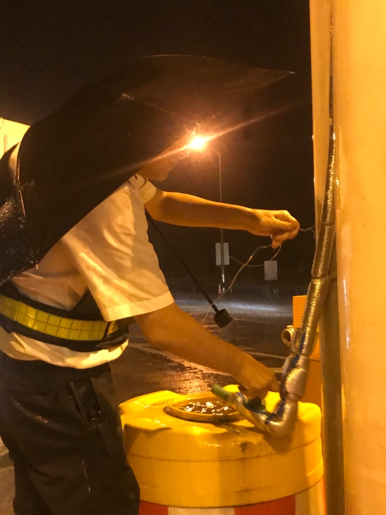 圖為收費(fèi)員不顧狂風(fēng)暴雨捆綁水管