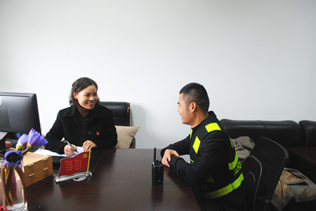 圖為臺州收費(fèi)所所長助理牟妲與二班班長馬德偵談心
