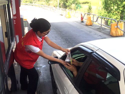 8月10日,臺州南收費所的部分黨員、團員一大早就來到所里,將綠豆紅棗湯、涼粉等消暑物品分杯、添糖、加水、封口,為一年一次的“送清涼”活動作準備?!八颓鍥觥被顒邮窃撍驹刚叻贞牱丈鐣膬热葜?,是臺州高速的一道風景。