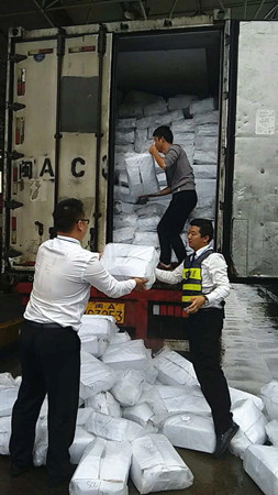 圖為工作人員幫忙搬運(yùn)掉落的貨物 這輛滿載海鮮的綠農(nóng)車,貨物掉滿車道,司機(jī)一人束手無策,當(dāng)班班長陳豐平在拍完綠農(nóng)照片后,叫上班員林葉輝,一起快速幫助司機(jī)一件一件地傳遞貨物。盡管每一袋貨物都十分重,但是他們?yōu)榱藥椭鷰煾堤嵩缯碡浳铮櫜坏媚樕辖豢椀暮顾陀晁?/span> 由于工作人員的幫助,司機(jī)離開時(shí)一直道謝。他們對司乘人員的主動援助,使得溫嶺西收費(fèi)所的服務(wù)不單單停留在窗口問候上,還將延伸服務(wù)一直呈現(xiàn)。 陳豐平