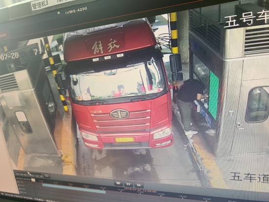 圖為失主遺落錢財(cái)現(xiàn)場(chǎng) 當(dāng)天上午,收費(fèi)班長(zhǎng)李寧巡查時(shí)在第五車道窗口附近發(fā)現(xiàn)了三百元現(xiàn)金,經(jīng)多方確定不是所內(nèi)工作人員遺失后,判斷為過(guò)往司機(jī)不小心遺失。為了盡快找到失主,李寧隨即去監(jiān)控室調(diào)取視頻查找。 經(jīng)過(guò)監(jiān)控查找,馬上鎖定了一輛車牌為“豫”字開頭的大貨車。原來(lái)當(dāng)時(shí)因駕駛室距離窗口較遠(yuǎn),司機(jī)下車付錢,監(jiān)控中清晰顯示司機(jī)在掏錢繳費(fèi)時(shí)三百塊現(xiàn)金從口袋里掉到車道上,但是司機(jī)因?yàn)橼s路絲毫沒有發(fā)覺。確認(rèn)失主后,工作人員查詢司機(jī)電話并取得聯(lián)系,告知其遺失三百現(xiàn)金,在通過(guò)微信確認(rèn)身份后,李寧將錢轉(zhuǎn)給了司機(jī)。