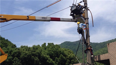 圖為執(zhí)勤人員配合供電部門安裝高壓線路