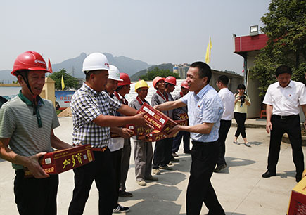圖為公司副董事長、總經理張建平給內環路一線人員送上消暑慰問品 張建平親自將一箱箱的消暑慰問物資送到每位一線工作人員手中,向他們表達公司的謝意。同時詢問了工期進展情況,當前存在的困難和問題,要求他們注意安全,合理安排工程,保證施工質量,上下同心,不懈努力,確保11月11日主線通車目標的實現。