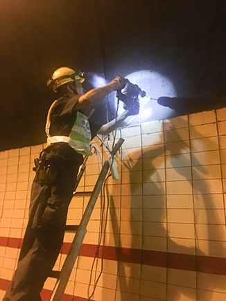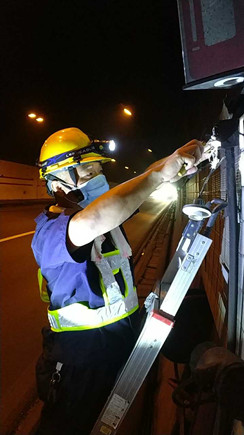 圖為工作人員安裝消防燈燈泡 大溪嶺—湖霧嶺隧道全長(zhǎng)4116米,為保障隧道內(nèi)行車安全、暢通、舒適,定期組織安排清洗隧道兩壁墻體、邊溝,檢修內(nèi)部各項(xiàng)機(jī)電設(shè)施成了維養(yǎng)中心每季必不可少的工作之一。而每次清洗檢修必將涉及封道,為最大程度減少因封道對(duì)社會(huì)造成的負(fù)面影響,中心工作人員早在一周前就對(duì)隧道內(nèi)各項(xiàng)損壞機(jī)電設(shè)備進(jìn)行摸底統(tǒng)計(jì),以便合理制定維修方案和安排施工人員。 12號(hào)早上7點(diǎn),隨著封道工作就緒,兩組清洗隊(duì)伍分別從隧道中部開始向兩頭清洗,六組專業(yè)燈具維修人員站在貨車腳手架上由北往南逐個(gè)推進(jìn),發(fā)現(xiàn)一盞修復(fù)一盞,或更換燈管、或更換觸發(fā)器、或更換鎮(zhèn)流器,對(duì)于一些同時(shí)有多個(gè)配件壞死或腐蝕嚴(yán)重的燈具就直接采取整體更換措施,大大提高了工作效率。而中心工作人員除了現(xiàn)場(chǎng)全程協(xié)調(diào)管理以外,還負(fù)責(zé)修復(fù)隧道兩壁逃生標(biāo)志及報(bào)警電話等多個(gè)指示牌。按照之前制定的計(jì)劃,六人兵分兩組由隧道兩頭分別向中間修復(fù),這樣既能與其他工作同時(shí)進(jìn)行又不造成相互干擾。另外一人則配合隧道所一起在登高車協(xié)助下,對(duì)洞內(nèi)各類攝像頭進(jìn)行逐個(gè)清理,全場(chǎng)人員各司其職,各盡其責(zé),現(xiàn)場(chǎng)一派忙碌的景象。 4公里多長(zhǎng)的隧道,由于流動(dòng)性差,洞內(nèi)空氣質(zhì)量比霧霾嚴(yán)重?cái)?shù)倍,僅一只口罩根本凈化不了廢氣,但由于時(shí)間緊,任務(wù)重,中心隊(duì)員和施工人員顧不上惡劣的環(huán)境,努力和時(shí)間賽跑,兩日下來(lái)共修復(fù)(清理)損壞燈具100余套,各類標(biāo)志指示牌40余塊,攝像頭30余個(gè),恢復(fù)了隧道內(nèi)各項(xiàng)機(jī)電設(shè)施的正常運(yùn)行,排除一切安全隱患,有效保證了隧道安全暢通。 項(xiàng)寅曉
