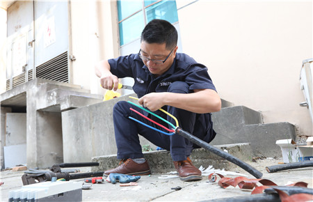 臺州收費所倉庫前方的空地,電工操作的選手們一字排開,他們熟練地用電工刀,在電纜上輕輕一劃一轉,整個絕緣外殼立馬脫離,緊接著去鉛皮、掰角度、壓接頭,不到10分鐘,一根三相四線電纜接頭就此制作完成了。