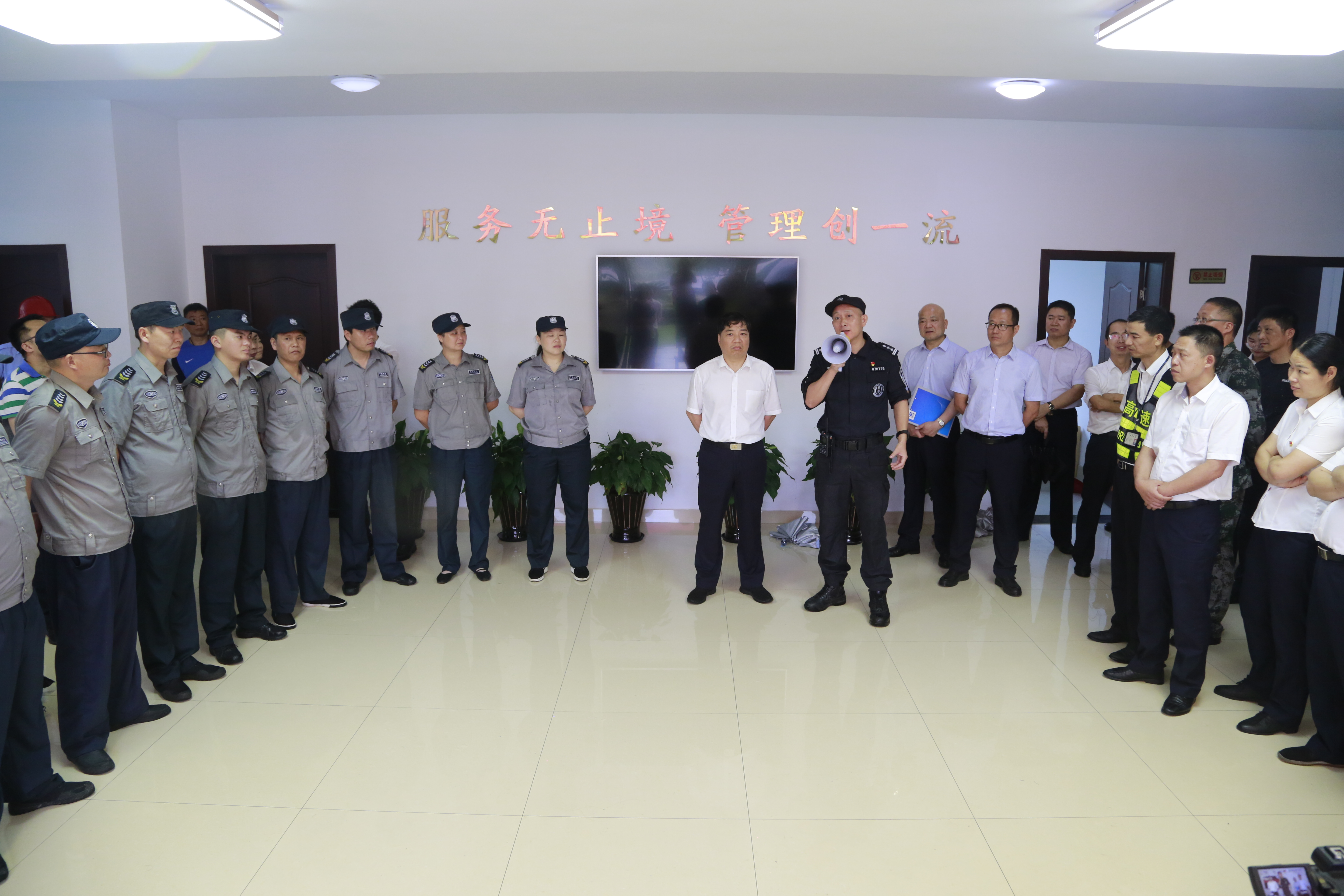 圖為物業人員現場練習器械使用 演練開始前,盧尚明對防爆盾牌、防爆鋼叉、抓捕器、警棍等各類防爆器材的功能和使用方法進行一一講解,并示范操作,以及帶領大樓浙師大印象物業人員現場練習器械使用。