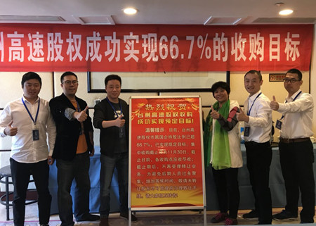 11月13日上午,高速股權集中收購已經成功實現(xiàn)臺州市屬國企及黃巖財務開發(fā)公司持股66.7%的預定目標。但股東轉讓熱情依然高漲,經常出現(xiàn)全市各收購點股東絡繹不絕、排隊轉讓的火爆場面。
