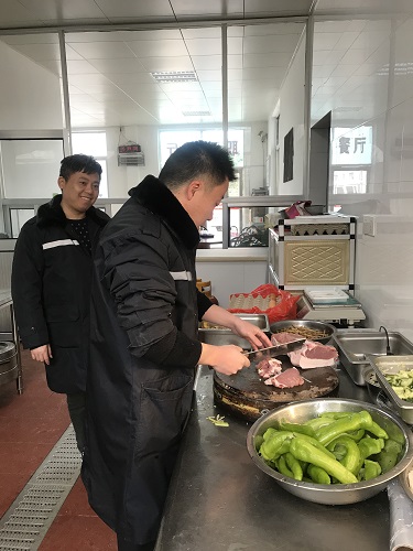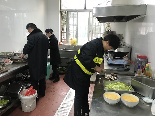 圖為工作人員幫忙做飯 臨近春節又正值春運期間,一時也找不到人員替代。為了保證員工正常用餐,中午,楊瑩瑩決定親自下廚為員工做飯,冰冷的水里直接洗菜,掄起廚刀剁肉切菜,卷起袖子熱鍋炒菜,儼然成為合格的大廚。副所長周超、杜佳自動加入司廚行列,其他行政人員在一旁配合摘菜、剝蒜等等,正在休息的班組其他人員見狀也紛紛前來幫忙。這一刻,小小廚房其樂融融,那是家的味道。午餐過后,楊瑩瑩又開始考慮晚餐和明天的早餐,但是她不再發愁,因為身后還有無數個他們。