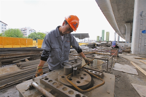 馬進學告訴記者,在鋼筋工這么多道工序里,將加工好的半成品鋼筋通過彎曲機制作成型是一道需要細心和耐心俱備的工序,無論是加工時的站位還是彎曲點的選擇都是對一個鋼筋工技藝的考驗,所以工作的時候必須集中精神格外小心。