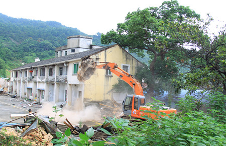 圖為挖掘機正在拆除軍產(chǎn)房屋